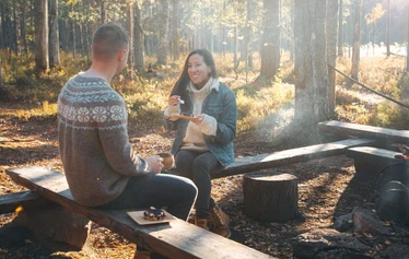 Retken aikana pidetään sopivasti taukoja, nappaillaan mukavia kuvamuistoja ja evästellään juoman sekä suolaisen ja makean kera nuotiopaikalla.